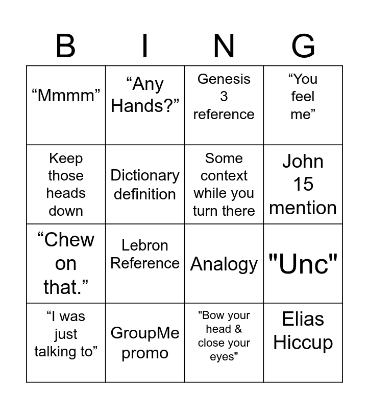 This bingo card has 18 words: Lebron Reference, Elias Hiccup, Genesis 3 reference, “Mmmm”, Analogy, “You feel me”, “I was just talking to”, “Any Hands?”, John 15 mention, “Chew on that.”, "Bow your head & close your eyes", Keep those heads down, "Unc", Dictionary definition, Some context while you turn there, Mr. G mention, GroupMe promo and Random Icebreaker.