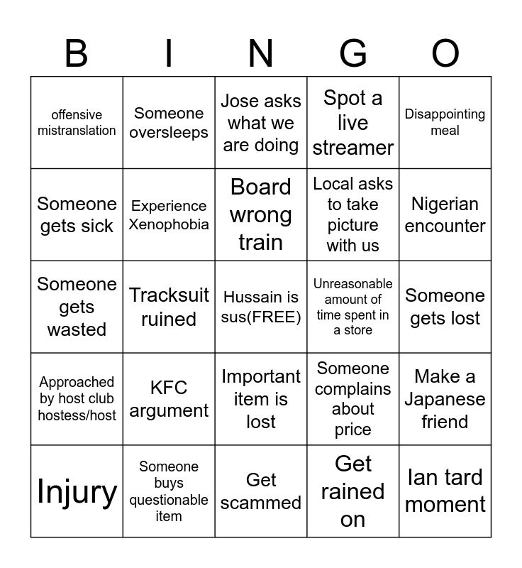 This bingo card has a free space and 24 words: KFC argument, Someone buys questionable item, Board wrong train, Injury, Disappointing meal, offensive mistranslation, Someone gets sick, Someone oversleeps, Unreasonable amount of time spent in a store, Important item is lost, Local asks to take picture with us, Someone gets wasted, Someone complains about price, Make a Japanese friend, Experience Xenophobia, Get rained on, Someone gets lost, Jose asks what we are doing, Nigerian encounter, Tracksuit ruined, Ian tard moment, Approached by host club hostess/host, Spot a live streamer and Get scammed.