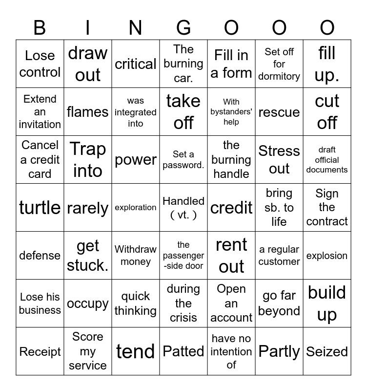 This bingo card has 64 words: in good shape, Sign the contract, clients, Stress out, Withdraw money, Receipt, draw out, Make a reservation, Extend an invitation, Score my service, Set a password., Open an account, Cancel a credit card, Fill in a form, Reschedule a meeting, Set off for dormitory, With bystanders' help, Lose control, Crash into, flames, power, Trap into, The burning car., get stuck., abandon, a regular customer, the passenger -side door, bring sb. to safety, bring sb. to life, Lose his business, face immigration issues, during the crisis, estimate, reveal, was integrated into, draft official documents, go far beyond, exploration, explosion, fill up., take off, cut off, build up, rush out, tend, rescue, turtle, Handled (vt.), the burning handle, Patted, Partly, Seized, rarely, defense, bravery, quick thinking, critical, logical thinking, rent out, occupy, have no intention of, musical instrument, credit and solar energy.