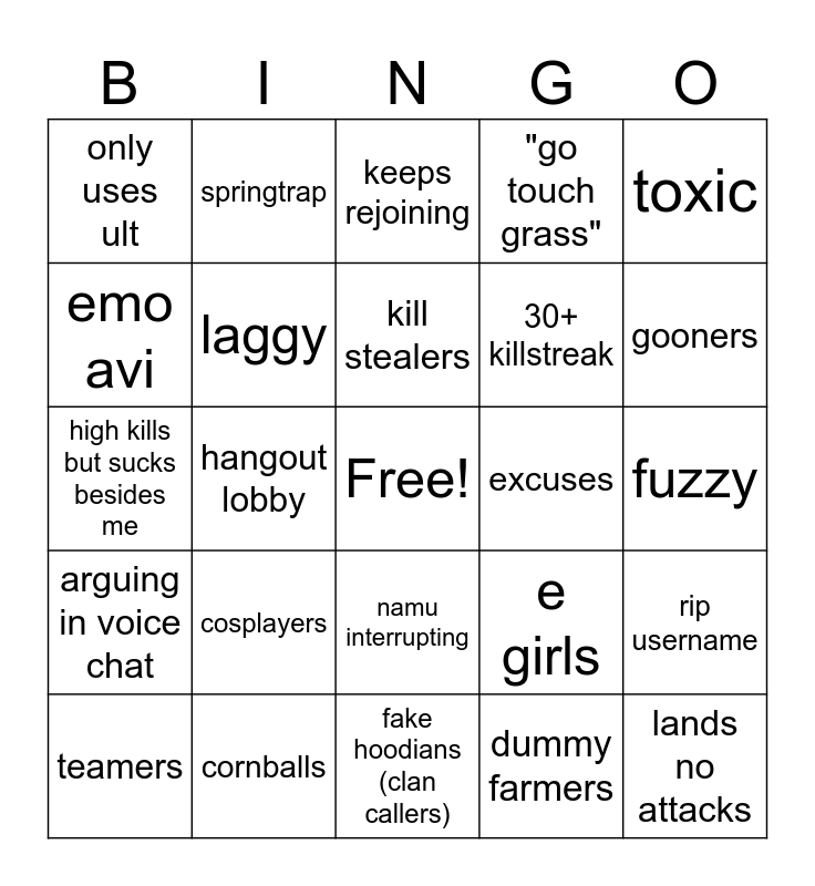 This bingo card has a free space and 24 words: teamers, cosplayers, kill stealers, dummy farmers, toxic, only uses ult, springtrap, keeps rejoining, excuses, fuzzy, high kills but sucks besides me, laggy, e girls, rip username, emo avi, cornballs, fake hoodians (clan callers), "go touch grass", gooners, arguing in voice chat, hangout lobby, namu interrupting, 30+ killstreak and lands no attacks.