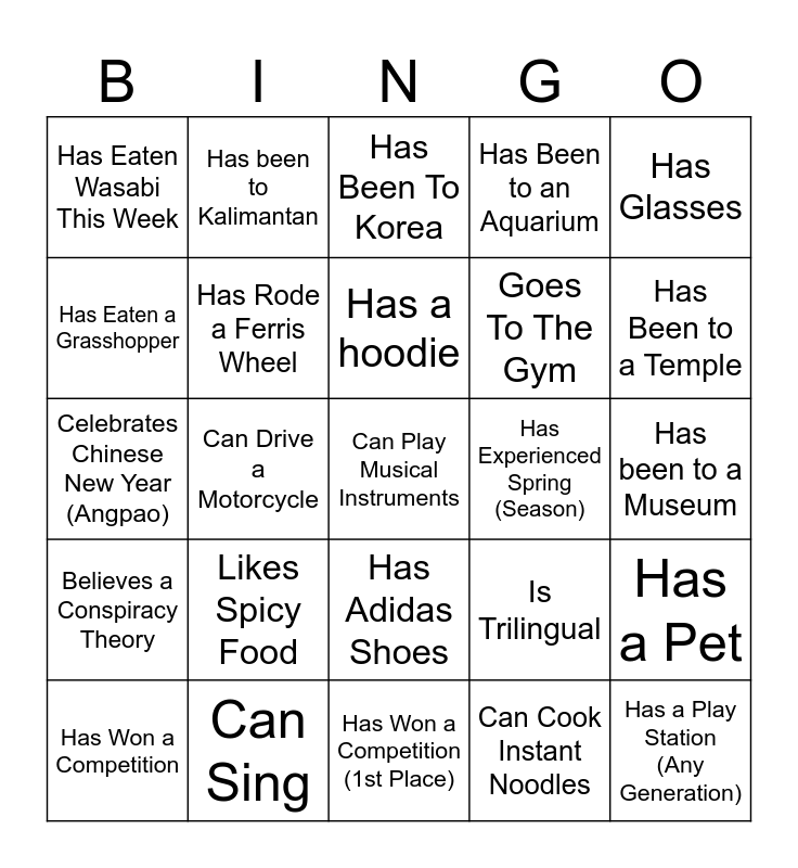 This bingo card has a free space and 24 words: Likes Spicy Food, Can Sing, Has a hoodie, Has Won a Competition, Has Glasses, Has Eaten Wasabi This Week, Has Eaten a Grasshopper, Has been to Kalimantan, Has Experienced Spring (Season), Has Adidas Shoes, Goes To The Gym, Celebrates Chinese New Year (Angpao), Is Trilingual, Has a Pet, Has Rode a Ferris Wheel, Can Cook Instant Noodles, Has been to a Museum, Has Been To Korea, Has Been to a Temple, Can Drive a Motorcycle, Has a Play Station (Any Generation), Believes a Conspiracy Theory, Has Been to an Aquarium and Has Won a Competition (1st Place).