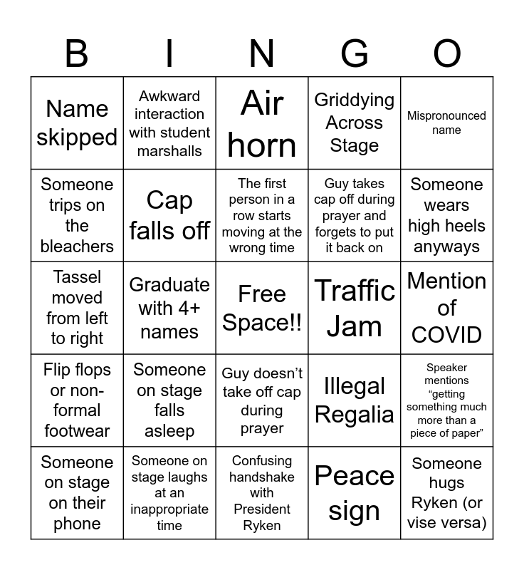 This bingo card has a free space and 24 words: Someone on stage falls asleep, Someone on stage laughs at an inappropriate time, The first person in a row starts moving at the wrong time, Someone on stage on their phone, Mispronounced name, Name skipped, Someone trips on the bleachers, Awkward interaction with student marshalls, Traffic Jam, Guy doesn’t take off cap during prayer, Guy takes cap off during prayer and forgets to put it back on, Tassel moved from left to right, Illegal Regalia, Speaker mentions “getting something much more than a piece of paper”, Cap falls off, Peace sign, Mention of COVID, Air horn, Someone wears high heels anyways, Graduate with 4+ names, Someone hugs Ryken (or vise versa), Flip flops or non-formal footwear, Griddying Across Stage and Confusing handshake with President Ryken.