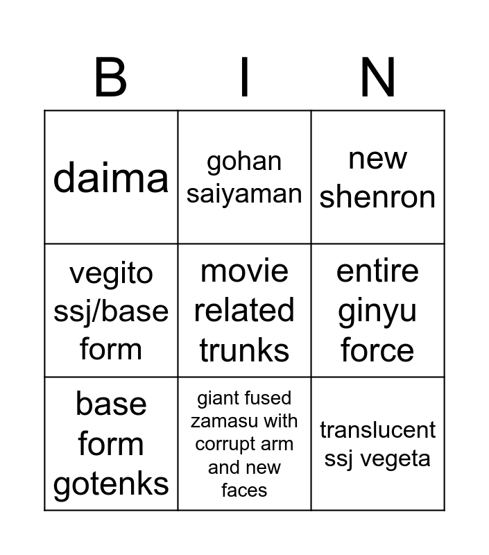 This bingo card has a free space and 8 words: entire ginyu force, new shenron, gohan saiyaman, base form gotenks, daima, translucent ssj vegeta, vegito ssj/base form and giant fused zamasu with corrupt arm and new faces.
