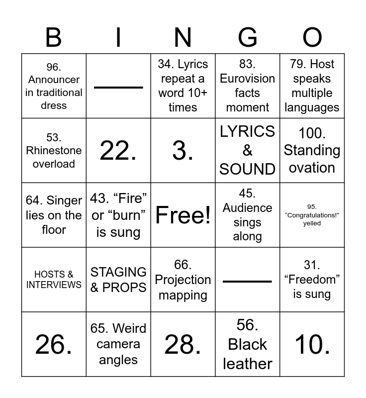 This bingo card has a free space and 111 words: Key change, 2., 3., 4., 5., 6., 7., 8., 9., 10., 11., 12., 13., 14., 15., 16., 17., 18., 19., 20., 21., 22., 23., 24., 25., 26., 27., 28., 29., 30., ⸻, LYRICS & SOUND, 31. “Freedom” is sung, 32. “Heart” is sung, 33. “Forever” is sung, 34. Lyrics repeat a word 10+ times, 35. Non-English lyrics, 36. Country name in lyrics, 37. “Eurovision” mentioned, 38. Screamed final note, 39. Lyrics talk about stars or space, 40. Gibberish or made-up words, 41. Emotional spoken intro, 42. Whistle note, 43. “Fire” or “burn” is sung, 44. Awkward silence in song, 45. Audience sings along, ⸻, OUTFITS & STYLE, 46. Someone in a silver outfit, 47. Giant headpiece, 48. Abs on display, 49. Glitter attack, 50. Platform boots, 51. Retro ‘80s vibes, 52. All-white outfit, 53. Rhinestone overload, 54. National costume elements, 55. Someone wears wings, 56. Black leather, 57. Mullet sighting, 58. Face paint or glitter, 59. Robe or cloak, 60. Sunglasses at night, ⸻, STAGING & PROPS, 61. Giant prop appears, 62. Mirror effect, 63. Someone uses stairs, 64. Singer lies on the floor, 65. Weird camera angles, 66. Projection mapping, 67. Prop fail, 68. Strobe warning moment, 69. Glitter bomb, 70. Something breaks, 71. A couch or bed is on stage, 72. Flying object, 73. Ladder or scaffold used, 74. Dancers in masks, 75. Hand choreography, ⸻, HOSTS & INTERVIEWS, 76. Awkward banter, 77. Outfit change, 78. Bad joke falls flat, 79. Host speaks multiple languages, 80. Host tries to sing, 81. Interview cut short, 82. Standing ovation, 83. Eurovision facts moment, 84. Host flirts with contestant, 85. Long pause before results, ⸻, VOTING SECTION, 86. “Douze points!”, 87. Audience boos a result, 88. Unexpected country gets high points, 89. Points delay glitch, 90. Someone cries during results, 91. Country gives itself 12 points, 92. Announcer waves too much, 93. Someone forgets their line, 94. Tie on scoreboard, 95. “Congratulations!” yelled, 96. Announcer in traditional dress, 97. Points called in wrong order, 98. Surprise top 5 entry, 99. Jury/televote shock twist, 100. Standing ovation and 101. Epic losing reaction.