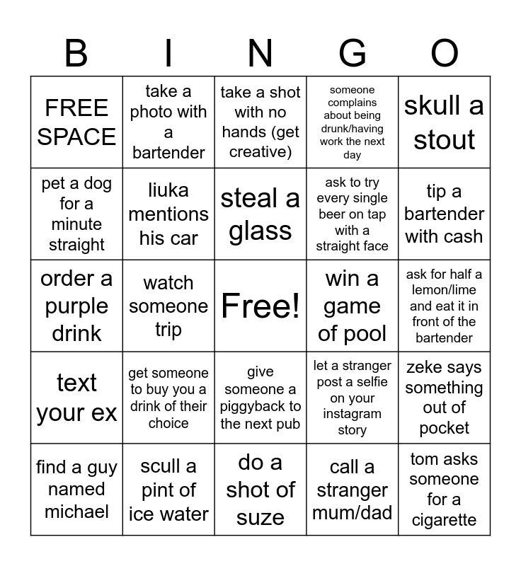 This bingo card has a free space and 25 words: get someone to buy you a drink of their choice, do a shot of suze, steal a glass, find a guy named michael, skull a stout, FREE SPACE, pet a dog for a minute straight, take a photo with a bartender, win a game of pool, give someone a piggyback to the next pub, ask to try every single beer on tap with a straight face, order a purple drink, let a stranger post a selfie on your instagram story, zeke says something out of pocket, liuka mentions his car, ethan talks about whisky/wine, ask for half a lemon/lime and eat it in front of the bartender, take a shot with no hands (get creative), tip a bartender with cash, watch someone trip, tom asks someone for a cigarette, scull a pint of ice water, text your ex, someone complains about being drunk/having work the next day and call a stranger mum/dad.
