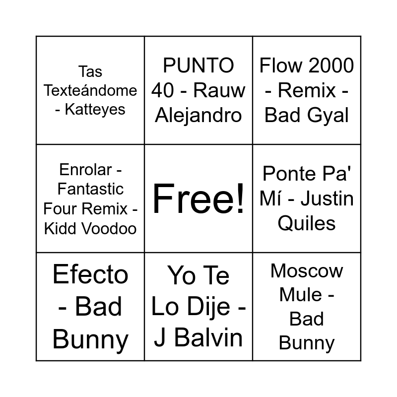 This bingo card has a free space and 181 words: Un Sueño - Alex Gargolas, Fuera del Planeta - Eloy, Gata Gangster - Daddy Yankee, 5 Letras - Alexis y Fido, Yo Te Lo Dije - J Balvin, Ven Bailalo - Reggaeton Mix - Angel Y Khriz, Nadie Como Tú - Wisin & Yandel, Abusadora - Wisin & Yandel, Dile Que Tú Me Quieres - Ozuna, Fuera del Planeta - Randy, Superhéroe - Alexis y Fido, Mi Mayor Atracción - Tony Dize, Yo Voy (feat. Daddy Yankee) - Zion & Lennox, Ahora Es - Wisin & Yandel, Ponte Pa' Mí - Justin Quiles, Gato de Noche - Ñengo Flow, Igual Que Ayer - R.K.M & Ken-Y, Discoteca - Casa De Leones, Yo No Soy Tu Marido - Nicky Jam, Me Niegas - Baby Rasta y Gringo, Eh Oh Eh Oh - Jowell & Randy, La Pregunta - J Alvarez, 6 AM - J Balvin, Jeans - Justin Quiles, No Te Veo - Remix - Casa De Leones, Junto Al Amanecer - J Alvarez, Permíteme (feat. Yandel) - Tony Dize, Noche de Travesura - Héctor El Father, Si No Le Contesto - Plan B, Aparentemente - Yaga & Mackie, La Botella - Mach & Daddy, Sábado Rebelde - Daddy Yankee, No Me Dejes Solo - Daddy Yankee, Regálame Una Noche - J Alvarez, Burn It Up (feat. Wisin & Yandel) - R. Kelly, Solos (feat. Plan B) - Tony Dize, Pegao - Wisin & Yandel, Sexo, Sudor y Calor - J Alvarez, Un Bellaqueo - Ozuna, Ella Se Contradice (feat. Plan B) - Baby Rasta, Gata Fiera (feat. Joan) - Trebol Clan, Se Preparó - Ozuna, Al Natural (feat. Yandel) - Tego Calderón, Dónde Están las Gatas - Alex Gargolas, Soy Una Gárgola - Randy, Bien Loco - Nova y Jory, Amor Prohibido - Baby Rasta y Gringo, Romper La Disco (feat. Farruko, Zion, Lennox & DY) - Musicólogo y Menes, Pa' Que La Pases Bien - Arcángel, No Quiere Enamorarse - Remix - Ozuna, Web Cam - Farruko, Tocarte Toa (2008 / Remix) - Big Yamo, El Teléfono - Héctor El Father, Nada Va a Pasar - Yaga & Mackie, Aprovecha (feat. Daddy Yankee) - Nova y Jory, More - Zion, Me Matas - R.K.M & Ken-Y, Fanática Sensual - Plan B, Baila Morena - Remix - Hector & Tito, Siente el Boom (feat. Tito El Bambino & Randy) - Boy Wonder CF, Alócate - Zion, Ay Vamos - J Balvin, Perdóname - La Factoría, ¿Por Qué Te Demoras? - Plan B, Tiempos de Plan B - Maldy, El Farsante - Ozuna, Mala Conducta (feat. Franco El Gorila) - Alexis y Fido, En Su Nota - Don Omar, Ojos Que No Ven - Alexis y Fido, Frikitona - Plan B, Na De Na - Angel Y Khriz, Soy Igual Que Tú (feat. Toby Love) - Alexis y Fido, Pa Bajarte el Calentamiento - Jadiel El Incomparable, Me Quiere Besar - Alexis y Fido, Ahí Ahí Ahí - De La Ghetto, Lady - Mendez, Josephine - Radio Edit - Mendez, La Nueva y La Ex - Daddy Yankee, Pomposo - Remix - El Alfa, Hasta Abajo - Don Omar, Quizás - Remix - Tony Dize, Hola Beba - Farruko, Sensación del Bloque - De La Ghetto, Mayor Que Yo - Wisin & Yandel, Mírala Bien - Wisin & Yandel, Si Te Dejas Llevar - Ozuna, Esta Noche - Justin Quiles, Salgo Pa' La Calle - Daddy Yankee, Zun Da Da - Zion, Tu Príncipe - Daddy Yankee, Camuflaje - Remix - Alexis y Fido, Flow Natural - Tito El Bambino, Besos Mojados - Wisin & Yandel, Como Antes (feat. Wisin) - Yandel, Egoísta - Justin Quiles, Es un Secreto - Plan B, Pa' Que Retozen - Tego Calderón, Me Reclama - Mambo Kingz, Caile - Bad Bunny, Casa Sola - Kale “La Evolución”, ULTRA SOLO REMIX - Polimá Westcoast, Pégate - Standly, Sigue Bailandome - Yannc, La Santa - Bad Bunny, La Difícil - Bad Bunny, La Zona - Bad Bunny, Fashion Girl - Remix - Kidd Voodoo, La Corriente - Bad Bunny, PONTE LOKITA - Katteyes, VeLDÁ - Bad Bunny, SI NO ES CONTIGO - Cris Mj, Diabólica - Cris Mj, VOY A LLeVARTE PA PR - Bad Bunny, Gitana (feat. Bryartz) - Pablo Chill-E, Qué Pasaría... - Rauw Alejandro, EoO - Bad Bunny, PERRO NEGRO - Bad Bunny, La Old Skul - Rauw Alejandro, LOKERA - Rauw Alejandro, Una Vez - Bad Bunny, DILUVIO - Rauw Alejandro, Sexo Virtual - Rauw Alejandro, CLASSY 101 - Feid, No Me Conoce - Remix - Jhayco, Que Malo - Bad Bunny, A Tu Merced - Bad Bunny, Marisola - Remix - Cris Mj, Chulo pt.2 - Bad Gyal, Hey Mor - Ozuna, Cabaña - El Jordan 23, PUNTO 40 - Rauw Alejandro, Moscow Mule - Bad Bunny, Gato de Noche - Ñengo Flow, Safaera - Bad Bunny, Una Noche en Medellín - Cris Mj, Efecto - Bad Bunny, Cochinae - Julianno Sosa, Bailando - El Jordan 23, Dile a Él - Rauw Alejandro, Santa - Rvssian, Resentia - Pablo Chill-E, Tas Texteándome - Katteyes, PELIGROSA - FloyyMenor, Minnie <3 - Kidd Voodoo, GANAS - Julianno Sosa, A200 - King Savagge, Gata Only - FloyyMenor, APAGA EL CEL - FloyyMenor, Después De La 1 - Cris Mj, X ESO BB - Jere Klein, ANDO - Jere Klein, Ese Guille - Kidd Voodoo, Vida Peligrosa - Standly, Enrolar - Fantastic Four Remix - Kidd Voodoo, Dámelo (feat. DrefQuila y THAT) - Ceaese, Te Quiero Ver (feat. Polimá Westcoast y Young Cister) - Ceaese, Panamera - Standly, Fashion Girl - Remix - Kidd Voodoo, Grabándote:) - Kidd Voodoo, Siempre Pienso en Ti - Easykid, Bailemos Reggaeton - Standly, Cristina - Easykid, Misionar - DrefQuila, FINA - Bad Bunny, Party - Bad Bunny, GATITAS SANDUNGUERAS VOL.1 - Alvaro Diaz, NOXE CONTIGO - Young Cister, CON LOS AROS 22 - Young Cister, SAMURAI - Young Cister, DOLCE - Young Cister, Wau - Easykid, Bellakito - DrefQuila, LA TERAPIA - Young Cister, LA DROGA - Bad Bunny, DÁKITI - Bad Bunny, Bellakera - Easykid, 619 - Easykid, Tú Me Mientes - DrefQuila, LuisMi - Polimá Westcoast, Flow 2000 - Remix - Bad Gyal and Camuflaje - Alexis y Fido.