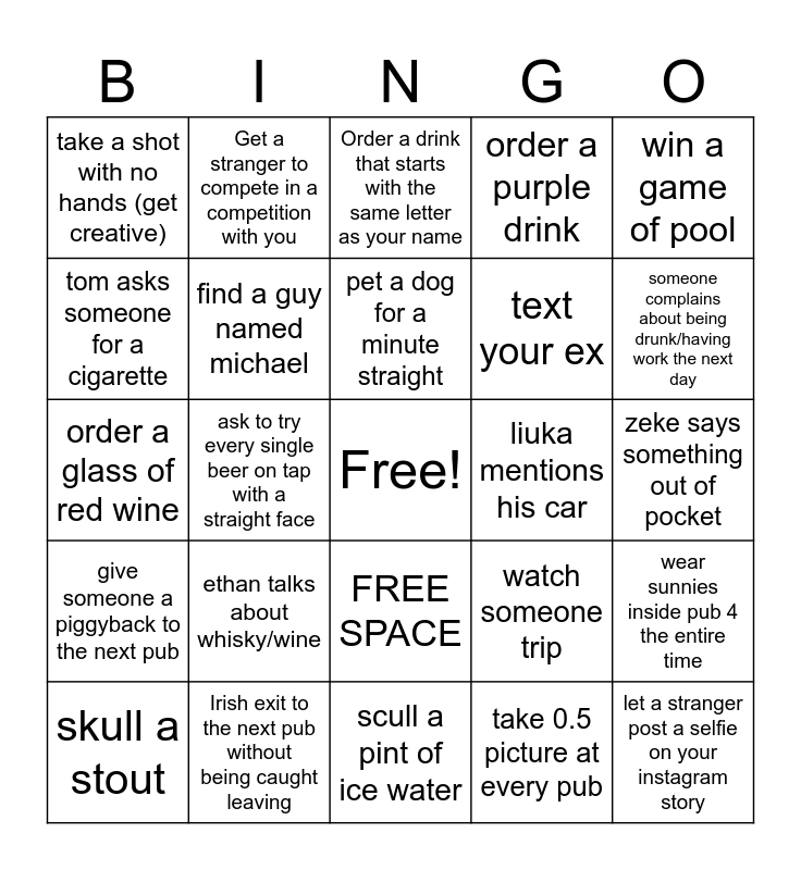 This bingo card has a free space and 39 words: get someone to buy you a drink of their choice, do a shot of suze, steal a glass, find a guy named michael, skull a stout, FREE SPACE, pet a dog for a minute straight, take a photo with a bartender, win a game of pool, give someone a piggyback to the next pub, ask to try every single beer on tap with a straight face, order a purple drink, let a stranger post a selfie on your instagram story, zeke says something out of pocket, liuka mentions his car, ethan talks about whisky/wine, ask for half a lemon/lime and eat it in front of the bartender, take a shot with no hands (get creative), tip a bartender with cash, watch someone trip, tom asks someone for a cigarette, scull a pint of ice water, text your ex, someone complains about being drunk/having work the next day, call a stranger mum/dad, Order a cocktail jug, Swap shirts with someone in a bar, David leaves after 2 pubs, Get someone to autograph your bingo sheet, Get a stranger to compete in a competition with you, Get your ID checked, No phone usage in pub 5, Order a drink that starts with the same letter as your name, Irish exit to the next pub without being caught leaving, take 0.5 picture at every pub, get a stranger to take a group photo, wear sunnies inside pub 4 the entire time, order a glass of red wine and order a black coffee.