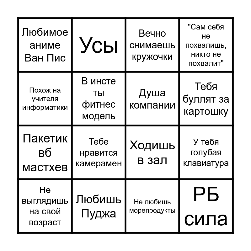 This bingo card has 16 words: Любишь Пуджа, У тебя голубая клавиатура, Вечно снимаешь кружочки, Любимое аниме Ван Пис, Пакетик вб мастхев, Усы, Ходишь в зал, Не любишь морепродукты, Похож на учителя информатики, В инсте ты фитнес модель, Не выглядишь на свой возраст, "Сам себя не похвалишь, никто не похвалит", Тебе нравится камерамен, Тебя буллят за картошку, Душа компании and РБ сила.