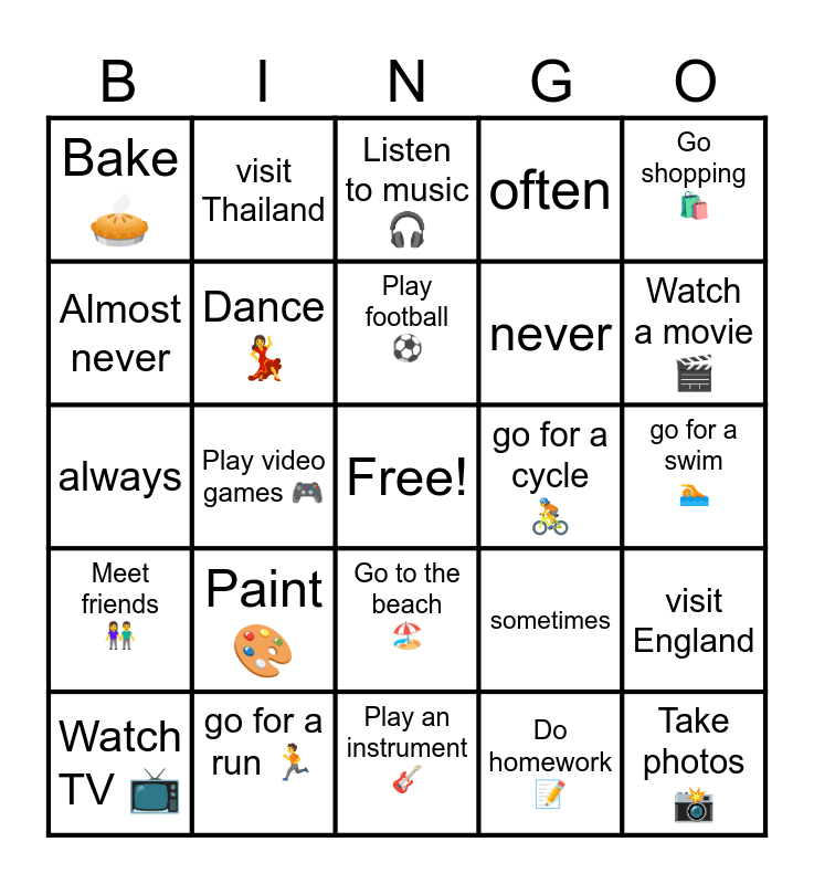 This bingo card has a free space and 29 words: Watch TV 📺, Read a book 📚, Play video games 🎮, Cook 🍳, Bake 🥧, Listen to music 🎧, Dance 💃, Paint 🎨, go for a cycle 🚴, go for a run 🏃, go for a swim 🏊, Take photos 📸, Play an instrument 🎸, Do homework 📝, Watch a movie 🎬, Play sports ⚽, Go to the beach 🏖️, Meet friends 👫, Go shopping 🛍️, always, sometimes, usually, never, Almost never, often, visit Thailand, visit England, Play football ⚽ and Study English 📚.