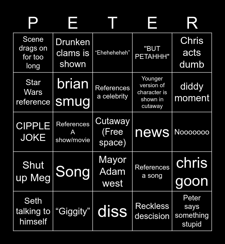 This bingo card has a free space and 27 words: References a song, Stewie insults Brian, Younger version of character is shown in cutaway, diss, Star Wars reference, “Eheheheheh”, Drunken clams is shown, Shut up Meg, news, chris goon, CIPPLE JOKE, ''BUT PETAHHH", Seth talking to himself, “Giggity”, diddy moment, Racist joke, brian smug, References a celebrity, Song, Scene drags on for too long, Nooooooo, Reckless descision, References A show/movie, Peter says something stupid, Mayor Adam west, Chris acts dumb and Peter acts dumb.