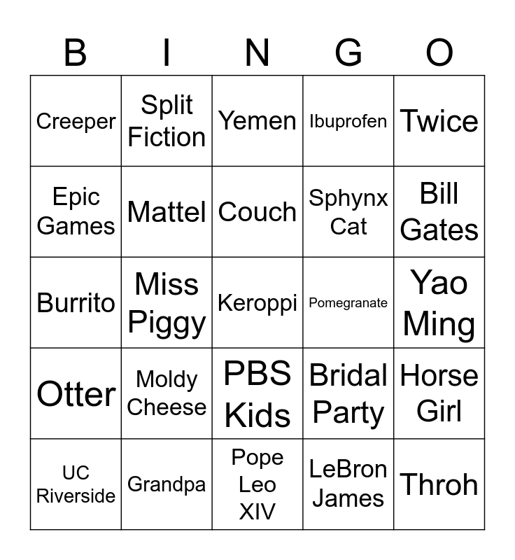 This bingo card has a free space and 24 words: Moldy Cheese, Grandpa, Couch, UC Riverside, Twice, Creeper, Epic Games, Split Fiction, Pomegranate, PBS Kids, Sphynx Cat, Burrito, Bridal Party, Horse Girl, Mattel, LeBron James, Yao Ming, Yemen, Bill Gates, Miss Piggy, Throh, Otter, Ibuprofen and Pope Leo XIV.