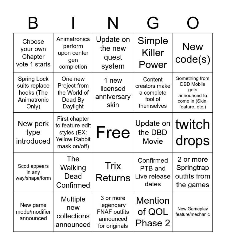 This bingo card has a free space and 24 words: New game mode/modifier announced, The Walking Dead Confirmed, 1 new licensed anniversary skin, Mention of QOL Phase 2, New code(s), Choose your own Chapter vote 1 starts, Animatronics perform upon center gen completion, Update on the new quest system, Update on the DBD Movie, twitch drops, New perk type introduced, One new Project from the World of Dead By Daylight, Confirmed PTB and Live release dates, 2 or more Springtrap outfits from the games, Spring Lock suits replace hooks (The Animatronic Only), Multiple new collections announced, 3 or more legendary FNAF outfits announced for originals, Simple Killer Power, Something from DBD Mobile gets announced to come in (Skin, feature, etc.), Scott appears in any way/shape/form, First chapter to feature edit styles (EX: Yellow Rabbit mask on/off), Trix Returns, Content creators make a complete fool of themselves and New Gameplay feature/mechanic.