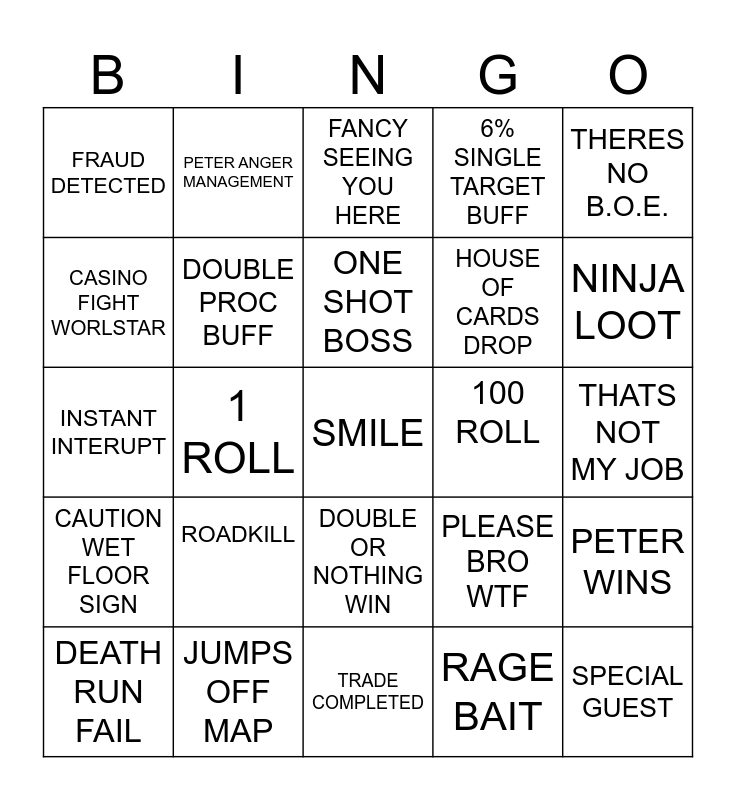 This bingo card has a free space and 24 words: ROADKILL, JUMPS OFF MAP, ONE SHOT BOSS, DEATH RUN FAIL, THERES NO B.O.E., FRAUD DETECTED, CASINO FIGHT WORLSTAR, PETER ANGER MANAGEMENT, 100 ROLL, DOUBLE OR NOTHING WIN, HOUSE OF CARDS DROP, INSTANT INTERUPT, PLEASE BRO WTF, PETER WINS, DOUBLE PROC BUFF, RAGE BAIT, THATS NOT MY JOB, FANCY SEEING YOU HERE, NINJA LOOT, 1 ROLL, SPECIAL GUEST, CAUTION WET FLOOR SIGN, 6% SINGLE TARGET BUFF and TRADE COMPLETED.