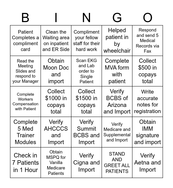 This bingo card has 25 words: Verify AHCCCS and Import, Verify Cigna and Import, Scan EKG and Lab order to Single Patient, Check in 7 Patients in 1 Hour, Respond and send 5 Medical Records via Fax, Patient Completes a compliment card, Read the Meeting Slides and respond to your Manager, Clean the Waiting area on inpatient and ER Side, Verify BCBS of Arizona and Import, Verify Summit BCBS and Import, Complete MVA form with patient, Complete Workers Compensation with Patient, Verify Medicare and Supplemental and Import, Obtain IMM signature and import, Obtain Moon Doc and import, Verify Aetna and Import, Write accurate notes for registration, Compliment your fellow staff for their hard work, Collect $500 in copays total, Collect $1000 in copays total, Collect $1500 in copays total, Obtain MSPQ for Vanilla Medicare Patients, Complete 5 Med Trainer Modules, Helped patient in by wheelchair and STAND AND GREET ALL PATIENTS.