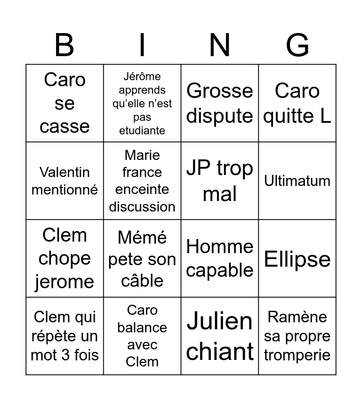 This bingo card has 16 words: Caro balance avec Clem, Ellipse, Grosse dispute, Caro se casse, Clem chope jerome, Jérôme apprends qu’elle n’est pas etudiante, Homme capable, Julien chiant, Valentin mentionné, Marie france enceinte discussion, Clem qui répète un mot 3 fois, Caro quitte L, Mémé pete son câble, Ultimatum, JP trop mal and Ramène sa propre tromperie.