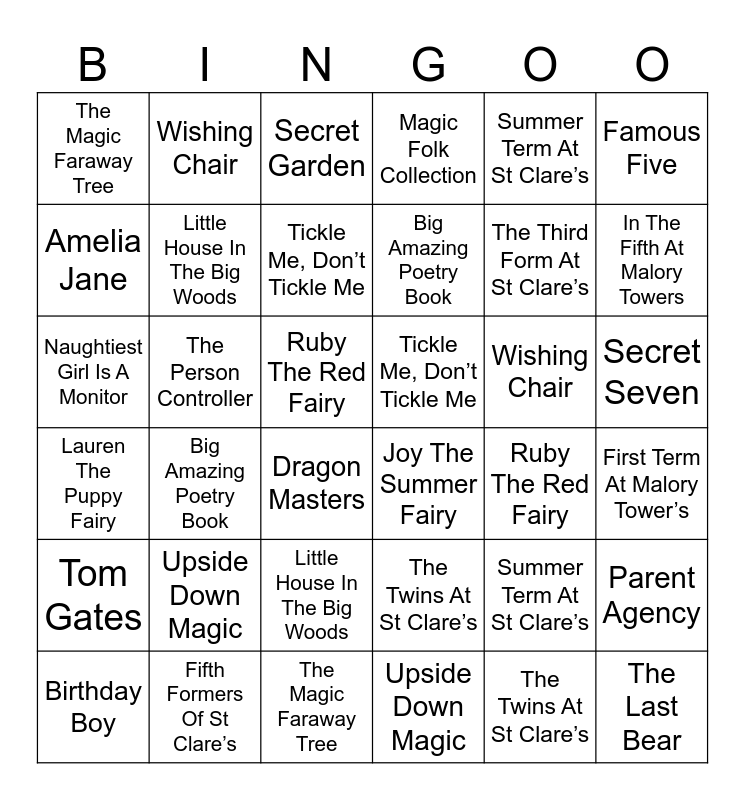 ⚠ This card has duplicate items: A Little Princess (2), The Last Bear (2), Secret Garden (2), Pages And Co. (2), Horrid Henry (2), Upside Down Magic (2), Dragon Masters (2), The Magic Faraway Tree (2), Heidi (2), Adventure Series (2), Little House In The Big Woods (2), Secret Seven (2), In The Fifth At Malory Towers (2), The Twins At St Clare’s (2), Naughtiest Girl Is A Monitor (2), The O’Clock Tales (2), Summer Term At St Clare’s (2), Fifth Formers Of St Clare’s (2), The Third Form At St Clare’s (2), Amelia Jane (2), Wishing Chair (2), Magic Folk Collection (2), Lightning Girl (2), My Naughty Little Sister (2), The Racehorse Who Wouldn’t Gallop (2), The Racehorse Who Disappeared (2), The Person Controller (2), Parent Agency (2), Holly The Christmas Fairy (2), Lauren The Puppy Fairy (2), Big Amazing Poetry Book (2), Tickle Me, Don’t Tickle Me (2), Joy The Summer Fairy (2), Trixie The Halloween Fairy (2), Ruby The Red Fairy (2), First Term At Malory Tower’s (2)