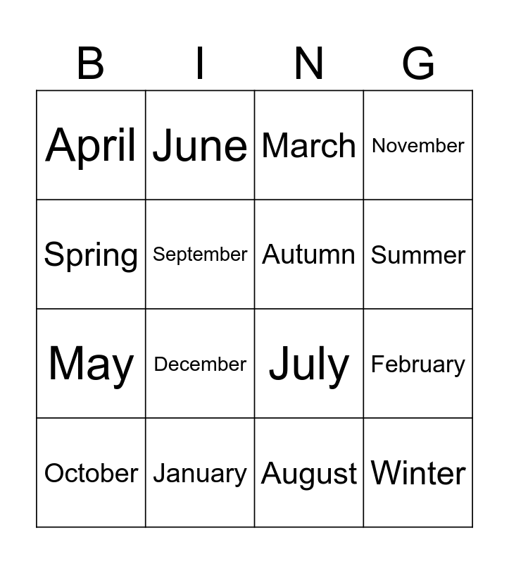 This bingo card has 16 words: January, February, March, April, May, June, July, August, Spring, September, October, November, December, Summer, Autumn and Winter.