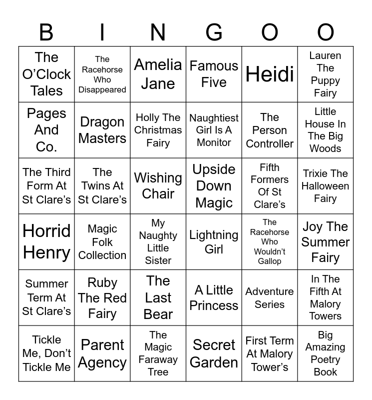 This bingo card has 36 words: A Little Princess, The Last Bear, Secret Garden, Pages And Co., Horrid Henry, Upside Down Magic, Dragon Masters, The Magic Faraway Tree, Heidi, Adventure Series, Little House In The Big Woods, Famous Five, In The Fifth At Malory Towers, The Twins At St Clare’s, Naughtiest Girl Is A Monitor, The O’Clock Tales, Summer Term At St Clare’s, Fifth Formers Of St Clare’s, The Third Form At St Clare’s, Amelia Jane, Wishing Chair, Magic Folk Collection, Lightning Girl, My Naughty Little Sister, The Racehorse Who Wouldn’t Gallop, The Racehorse Who Disappeared, The Person Controller, Parent Agency, Holly The Christmas Fairy, Lauren The Puppy Fairy, Big Amazing Poetry Book, Tickle Me, Don’t Tickle Me, Joy The Summer Fairy, Trixie The Halloween Fairy, Ruby The Red Fairy and First Term At Malory Tower’s.