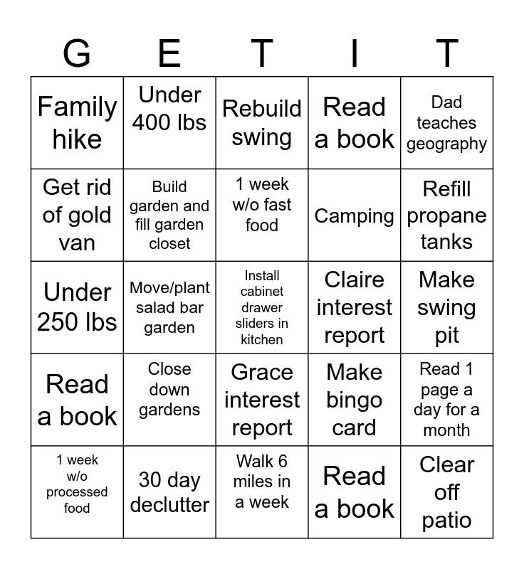 This bingo card has 25 words: Close down gardens, Walk 6 miles in a week, 1 week w/o fast food, 1 week w/o processed food, Dad teaches geography, Family hike, Get rid of gold van, Under 400 lbs, Claire interest report, Grace interest report, Camping, Under 250 lbs, Make bingo card, Read 1 page a day for a month, Build garden and fill garden closet, Clear off patio, Make swing pit, Rebuild swing, Refill propane tanks, Move/plant salad bar garden, Install cabinet drawer sliders in kitchen, 30 day declutter, Read a book, Read a book and Read a book.