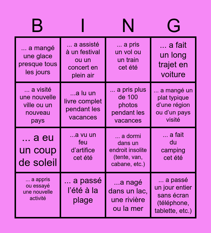 This bingo card has 16 words: ... a passé l’été à la plage, ... a fait du camping cet été, ... a pris un vol ou un train cet été, ... a mangé une glace presque tous les jours, ... a eu un coup de soleil, ... a assisté à un festival ou un concert en plein air, ... a dormi dans un endroit insolite (tente, van, cabane, etc.), ...a nagé dans un lac, une rivière ou la mer, ... a visité une nouvelle ville ou un nouveau pays, ...a lu un livre complet pendant les vacances, ... a appris ou essayé une nouvelle activité, ... a fait un long trajet en voiture, ...a vu un feu d’artifice cet été, ... a mangé un plat typique d’une région ou d’un pays visité, ... a pris plus de 100 photos pendant les vacances and ... a passé un jour entier sans écran (téléphone, tablette, etc.).