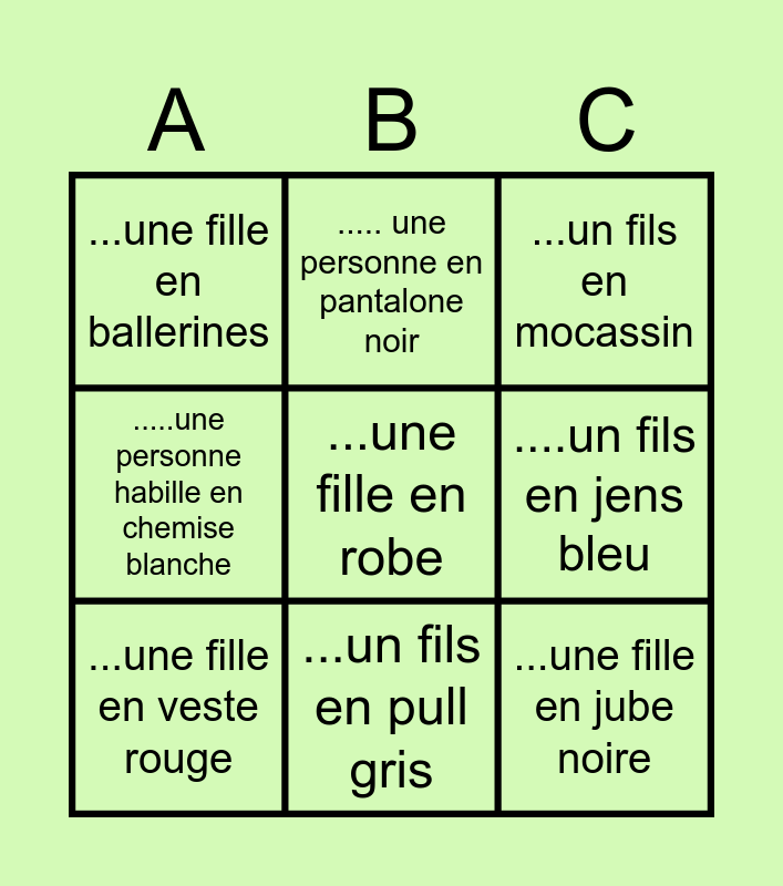 This bingo card has a free space and 8 words: .....une personne habille en chemise blanche, ..... une personne en pantalone noir, ....un fils en jens bleu, ...une fille en veste rouge, ...un fils en mocassin, ...une fille en ballerines, ...un fils en pull gris and ...une fille en jube noire.