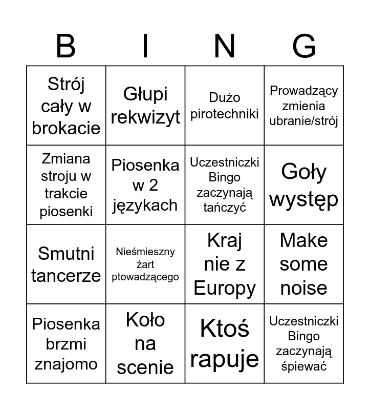 This bingo card has 16 words: Koło na scenie, Make some noise, Dużo pirotechniki, Strój cały w brokacie, Smutni tancerze, Głupi rekwizyt, Kraj nie z Europy, Ktoś rapuje, Zmiana stroju w trakcie piosenki, Piosenka w 2 językach, Piosenka brzmi znajomo, Prowadzący zmienia ubranie/strój, Nieśmieszny żart ptowadzącego, Goły występ, Uczestniczki Bingo zaczynają tańczyć and Uczestniczki Bingo zaczynają śpiewać.