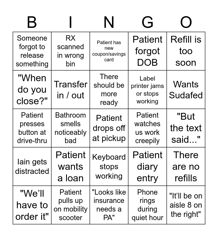 This bingo card has 25 words: Patient wants a loan, "Looks like insurance needs a PA", There should be more ready, "We’ll have to order it", Refill is too soon, Someone forgot to release something, "When do you close?", RX scanned in wrong bin, Patient watches us work creepily, Keyboard stops working, Label printer jams or stops working, Patient presses button at drive-thru, Patient diary entry, There are no refills, Transfer in / out, "It’ll be on aisle 8 on the right", "But the text said...", Patient has new coupon/savings card, Wants Sudafed, Bathroom smells noticeably bad, Patient drops off at pickup, Patient pulls up on mobility scooter, Iain gets distracted, Patient forgot DOB and Phone rings during quiet hour.