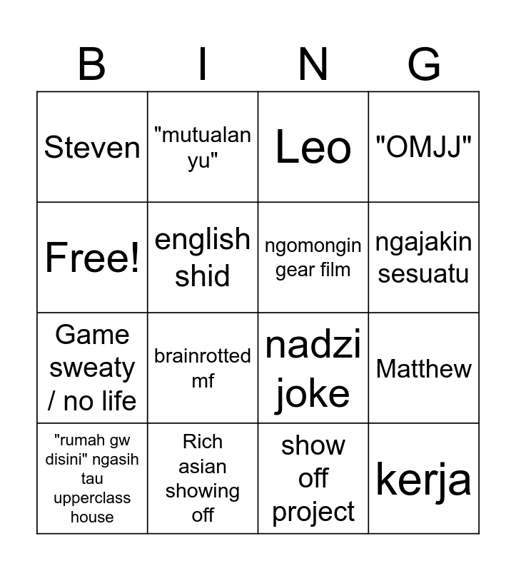 This bingo card has 16 words: Rich asian showing off, Matthew, Leo, Steven, Game sweaty / no life, "mutualan yu", nadzi joke, show off project, Free!, english shid, "rumah gw disini" ngasih tau upperclass house, "OMJJ", brainrotted mf, ngajakin sesuatu, ngomongin gear film and kerja.