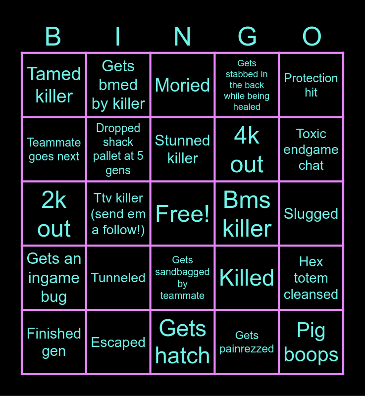 This bingo card has a free space and 24 words: Tunneled, Escaped, Stunned killer, Finished gen, Protection hit, Tamed killer, Teammate goes next, Gets bmed by killer, Bms killer, Gets sandbagged by teammate, 4k out, 2k out, Killed, Hex totem cleansed, Dropped shack pallet at 5 gens, Gets painrezzed, Slugged, Moried, Toxic endgame chat, Ttv killer (send em a follow!), Pig boops, Gets an ingame bug, Gets stabbed in the back while being healed and Gets hatch.
