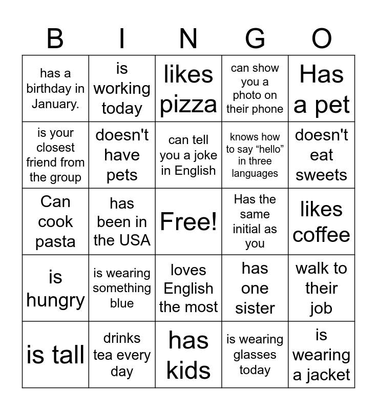 This bingo card has a free space and 24 words: is wearing something blue, drinks tea every day, can tell you a joke in English, is tall, Has a pet, has a birthday in January., is your closest friend from the group, is working today, Has the same initial as you, loves English the most, knows how to say “hello” in three languages, Can cook pasta, has one sister, walk to their job, doesn't have pets, is wearing glasses today, likes coffee, likes pizza, doesn't eat sweets, has been in the USA, is wearing a jacket, is hungry, can show you a photo on their phone and has kids.