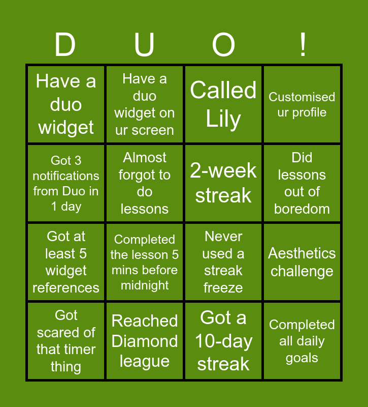 This bingo card has 16 words: Reached Diamond league, Aesthetics challenge, Called Lily, Have a duo widget, Got at least 5 widget references, Have a duo widget on ur screen, Never used a streak freeze, Got a 10-day streak, Got 3 notifications from Duo in 1 day, Almost forgot to do lessons, Got scared of that timer thing, Customised ur profile, Completed the lesson 5 mins before midnight, Did lessons out of boredom, 2-week streak and Completed all daily goals.