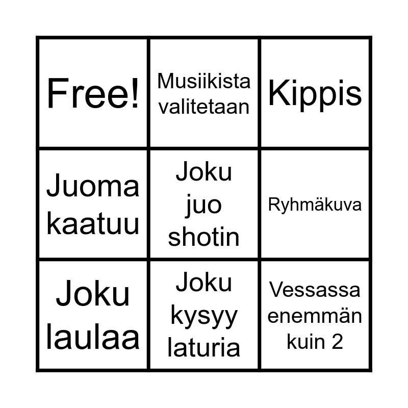 This bingo card has 9 words: Joku laulaa, Kippis, Musiikista valitetaan, Juoma kaatuu, Free!, Ryhmäkuva, Joku juo shotin, Vessassa enemmän kuin 2 and Joku kysyy laturia.
