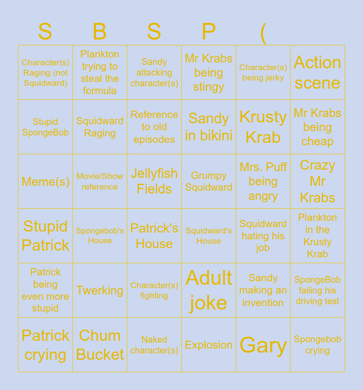This bingo card has 36 words: Adult joke, Character(s) fighting, Explosion, Stupid SpongeBob, Stupid Patrick, Grumpy Squidward, Squidward Raging, Naked character(s), Character(s) being jerky, Sandy making an invention, Mr Krabs being cheap, Mr Krabs being stingy, SpongeBob failing his driving test, Movie/Show reference, Sandy in bikini, Character(s) Raging (not Squidward), Patrick being even more stupid, Mrs. Puff being angry, Meme(s), Sandy attacking character(s), Jellyfish Fields, Spongebob's House, Squidward's House, Patrick's House, Squidward hating his job, Plankton trying to steal the formula, Krusty Krab, Chum Bucket, Reference to old episodes, Action scene, Spongebob crying, Patrick crying, Plankton in the Krusty Krab, Crazy Mr Krabs, Twerking and Gary.