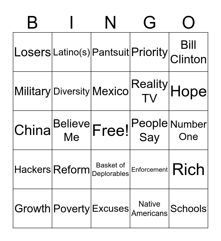 This bingo card has a free space and 254 words: 2nd Amendment, Access, Administration, Affair, Affordable Care Act, African Americans, All Lives Matter, Alt-Right, America, America first, American(s), Amnesty, Arkansas, Armed Forces, Asian American(s), Audit, Banks, Basket of Deplorables, Believe, Believe Me, Benghazi, Bernie Sanders, Better, Bigot, Bill Clinton, Birth certificate, Birther, Black Lives Matter, Build a wall, Candidate, Celebrity, Chelsea Clinton, Children, China, Chris Christie, Christian, Church, Citizen(s), Climate Change, Clinton, Clinton Foundation, Coal, Commander-in-Chief, Communities, Comprehensive, Congress, Country, Credible Source, Crime, Criminal, Crooked Hillary, Deal, Debate, Debt, Democrat(s), Democratic National Committee, Diaspora, Diversity, Divisive, Domestic, Donald Trump, Drugs, Economy, Education, Emails, Embolden, Energy, Enforcement, Evangelical, Excuses, Families, Federal, Foreign, Founding Fathers, Fox News, Future, Ghadafi, Goldman Sachs, Good, Government, Governors, Great, Growth, Gun, Hackers, Hard-working, Healthcare, Hispanic(s), History, Hofstra University, Hope, Huge, Human Rights, Illegal, Immigration, Important, Infrastructure, Intention, Iran, ISIS, Islamic State, Israel, Ivanka Trump, Job Killing, Jobs, Judgment, Khan Family, Latino(s), Leadership, Legislation, Liberal(s), Libya, Losers, Love, Make America Great Again, Manufacturing, Marco Rubio, Mark My Words, Maternity leave, Megan Kelly, Melania Trump, Mexico, Middle class, Military, Military Power, Millennial, Millions, Money, Mother, Mothers of the Movement, Muslims, Nation, National Debt, National Security, Native Americans, New, New York, Nuclear codes, Nuclear weapons, Number One, Obama, Order, Paid leave, Pantsuit, Paris/France, People, People Say, Photo, Plan, Pneumonia, Pocahontas, Police brutality, Policy Decisions, Policy Proposals, Politically (in)correct, Polls, Poverty, President, Priority, Profile, Progressive(s), Prosperity, Putin, Question, Racist, Radical Islam, Rally, Reagan, Reality TV, Reform, Refugee(s), Regret, Republican National Committee, Republican(s), Rhetoric, Rich, Right, Risk, Russia, Saudi Arabia, Scandal, Schools, Secret Service, Senate, Server, Service, Sexist, Skittles, Small business, Social security, State Department, States, Stronger together, Stupid, Support, Supreme Court, Surrogate(s), Syria, System, Taco Trucks, Take Our Country Back, Talking, Tax Breaks, Tax Raising, Tax Returns, Taxes, Tea Party, Ted Cruz, Temperamentally unfit, Terrorism, Terrorist, Think, Time, Together, Tonight, Tremendous, Trillions, Trump, Trump Foundation, Trump Tower, Trump University, Trustworthiness, Twitter/Tweet, United, Veterans, Volunteer(s), Voter ID Laws, Voter Suppression, Voters, Wall Street, War, Washington, Wealthy, Wells Fargo, Win, Woman Card, Women, World, Years, Zika, Income Tax Returns, Islamic Jihadist, Islamic Extremist, Build A Wall, Huge, Super PAC, Law and Order, WikiLeaks, Billy Bush, Access Hollywood, Abraham Lincoln, Rigged, Election Rigging Media and Trumped Up Trickle Down.