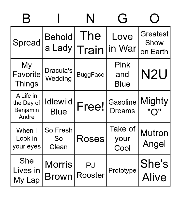 This bingo card has a free space and 36 words: Dyin' To Live, Chronomentrophobia, Life is Like A Musical, Dracula's Wedding, Take of your Cool, When I Look in your eyes, BuggFace, Makes No Sense At ALL, Greatest Show on Earth, Peaches, Idlewild Blue, Love in War, In Your Dreams, Gasoline Dreams, N2U, Spread, Hey Ya!, So Fresh So Clean, She's Alive, The Train, Mighty "O", Mutron Angel, Morris Brown, She Lives in My Lap, PJ Rooster, Behold a Lady, A Life in the Day of Benjamin Andre, Call the Law, Pink and Blue, My Favorite Things, Happy Valentine's Day, Hollywood Divorce, Prototype, Roses, Vibrate and A Bad Note.