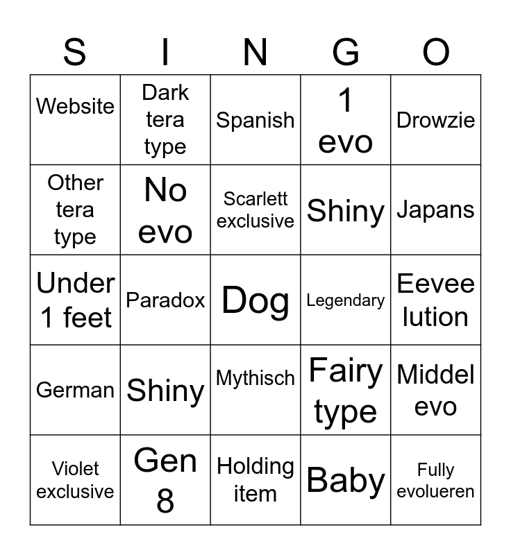 This bingo card has a free space and 24 words: Shiny, Gen 8, Scarlett exclusive, Violet exclusive, Drowzie, Website, Other tera type, Dark tera type, Legendary, Mythisch, Shiny, Under 1 feet, Fairy type, Middel evo, No evo, Baby, Eevee lution, Spanish, Japans, Paradox, Fully evolueren, German, 1 evo and Holding item.