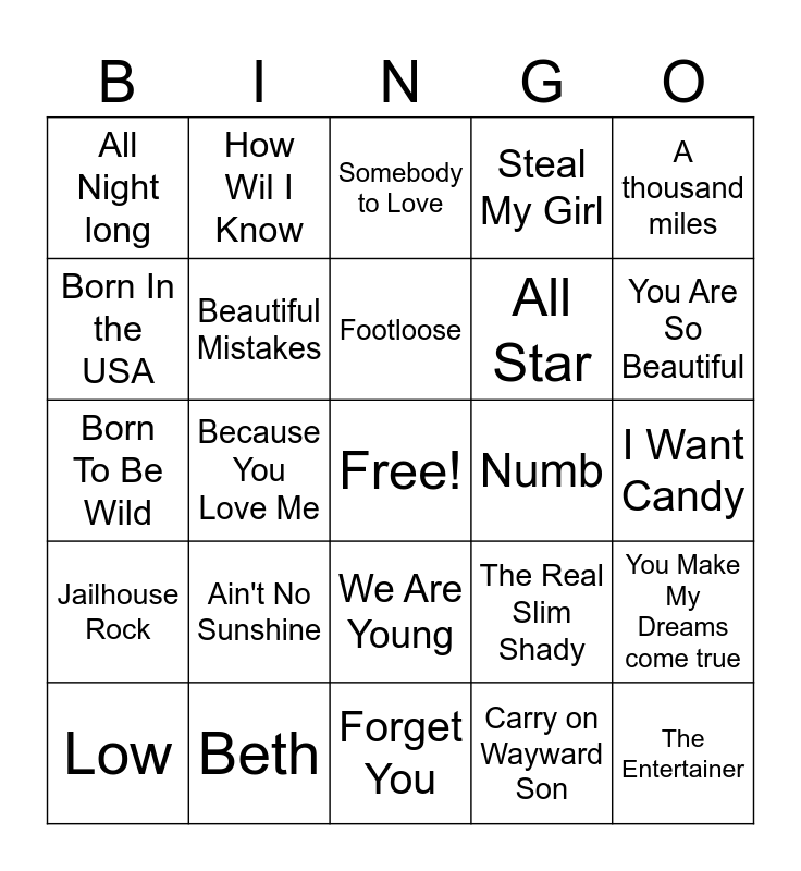 This bingo card has a free space and 24 words: Ain't No Sunshine, Beth, Footloose, Low, A thousand miles, All Night long, Born In the USA, How Wil I Know, Numb, We Are Young, All Star, Born To Be Wild, The Real Slim Shady, You Make My Dreams come true, Beautiful Mistakes, Carry on Wayward Son, I Want Candy, Somebody to Love, You Are So Beautiful, Because You Love Me, The Entertainer, Jailhouse Rock, Steal My Girl and Forget You.
