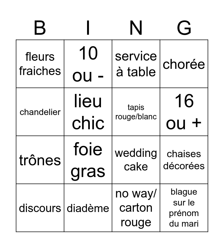 This bingo card has 16 words: diadème, chaises décorées, service à table, fleurs fraiches, trônes, 10 ou -, wedding cake, no way/ carton rouge, chandelier, lieu chic, discours, chorée, foie gras, 16 ou +, tapis rouge/blanc and blague sur le prénom du mari.