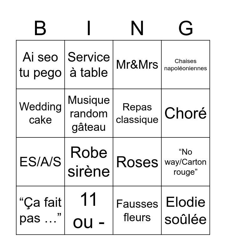 This bingo card has 16 words: 11 ou -, “No way/Carton rouge”, Mr&Mrs, Ai seo tu pego, ES/A/S, Service à table, Roses, Fausses fleurs, Wedding cake, Musique random gâteau, “Ça fait pas …”, Chaises napoléoniennes, Robe sirène, Choré, Repas classique and Elodie soûlée.