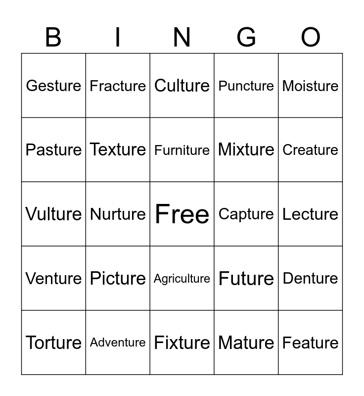 This bingo card has a free space and 24 words: Picture, Adventure, Furniture, Torture, Moisture, Gesture, Pasture, Fracture, Capture, Agriculture, Mixture, Vulture, Future, Denture, Texture, Mature, Lecture, Culture, Creature, Nurture, Feature, Venture, Puncture and Fixture.