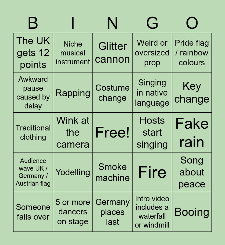 This bingo card has a free space and 25 words: Yodelling, Germany places last, Costume change, Someone falls over, Pride flag / rainbow colours, The UK gets 12 points, Awkward pause caused by delay, Niche musical instrument, Hosts start singing, Smoke machine, Singing in native language, Traditional clothing, Fire, Song about peace, Rapping, Performer wearing a hat, Fake rain, Glitter cannon, Key change, Wink at the camera, Booing, 5 or more dancers on stage, Audience wave UK / Germany / Austrian flag, Weird or oversized prop and Intro video includes a waterfall or windmill.