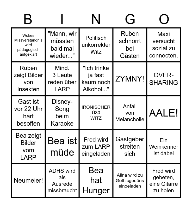 This bingo card has a free space and 24 words: Bea ist müde, ADHS wird als Ausrede missbraucht, "Ich trinke ja fast kaum noch Alkohol...", Neumeier!, Maxi versucht sozial zu connecten., Wokes Missverständnis wird pädagogisch aufgeklärt, Ruben zeigt Bilder von Insekten, "Mann, wir müssten bald mal wieder...", Anfall von Melancholie, Fred wird zum LARP eingeladen, ZYMNY!, Gast ist vor 22 Uhr hart besoffen, Gastgeber streiten sich, Ein Weinkenner ist dabei, Mind. 3 Leute reden über LARP, Alina wird zu Gothicgedöns eingeladen, AALE!, Politisch unkorrekter Witz, OVER- SHARING, Disney-Song beim Karaoke, Fred wird gebeten, eine Gitarre zu holen, Bea zeigt Bilder vom LARP, Ruben schnorrt bei Gästen and Bea hat Hunger.