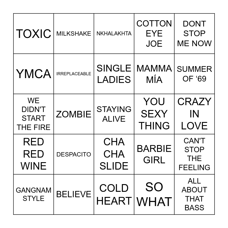 This bingo card has 59 words: Free!, BELIEVE, I'M GONNA BE (500 MILES), RED RED WINE, SO WHAT, LIVING LA VIDA LOCA, IRREPLACEABLE, FLOWERS, MAMMA MÍA, LOW, COTTON EYE JOE, JOLENE, YMCA, BECAUSE OF YOU, BUDAPEST, TOXIC, STAYING ALIVE, DONT STOP ME NOW, LOSLAPPIE, SINGLE LADIES, YOU SEXY THING, NKHALAKHTA, GANGNAM STYLE, CAN'T STOP THE FEELING, MY HEART WILL GO ON, BILLIE JEAN, DANCING QUEEN, MOVES LIKE JAGGER, SUMMER OF ‘69, SHAKE IT OFF, GIMME GIMME GIMME, BLACK OR WHITE, HELLO, BABY ONE MORE TIME, MILKSHAKE, HOLLABACK GIRL, BLINDING LIGHTS, ZOMBIE, BUILD ME UP BUTTERCUP, WE DIDN'T START THE FIRE, UPTOWN FUNK, DESPACITO, CRAZY IN LOVE, WHO LET THE DOGS OUT, IMPI, MAMBO NO 5, WAKA WAKA, HEY YAYOU'REE THE ONE THAT I WANT, CHA CHA SLIDE, COLD HEART, POKER FACE, I’M LIKE A BIRD, MACARENA, AFRICA, WANNABE, BARBIE GIRL, CALL ME MAYBE, ALL ABOUT THAT BASS and SWEET CAROLINE.