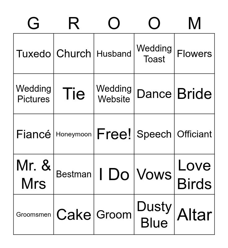 This bingo card has a free space and 29 words: Groomsmen, Rings, Honeymoon, Engagement, Tuxedo, Husband, Tie, Bestman, Speech, Cake, Officiant, Altar, Groom, Dusty Blue, Bride, Wedding Party, I Do, Mr. & Mrs, Flowers, Fiancé, Vows, Damara, Dance, Wedding Pictures, Wedding Toast, Church, Love Birds, Wedding Website and Groom.