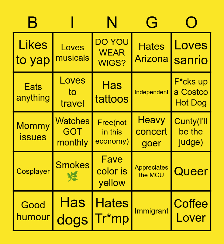 This bingo card has a free space and 24 words: Smokes 🌿, Has dogs, Has tattoos, Good humour, Loves sanrio, Likes to yap, Eats anything, Loves musicals, Heavy concert goer, Fave color is yellow, Independent, Mommy issues, Appreciates the MCU, Queer, Loves to travel, Immigrant, Cunty(I'll be the judge), DO YOU WEAR WIGS?, F*cks up a Costco Hot Dog, Watches GOT monthly, Coffee Lover, Cosplayer, Hates Arizona and Hates Tr*mp.