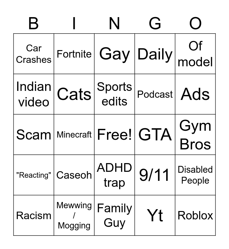 This bingo card has a free space and 24 words: Racism, Caseoh, Sports edits, Yt, Of model, Car Crashes, Fortnite, Gay, GTA, Gym Bros, Scam, Cats, 9/11, Disabled People, Indian video, Mewwing / Mogging, Family Guy, Daily, Ads, "Reacting", Minecraft, ADHD trap, Podcast and Roblox.