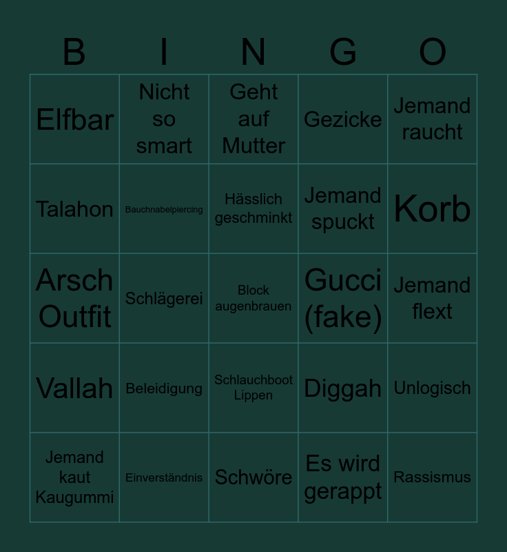 This bingo card has a free space and 24 words: Jemand kaut Kaugummi, Beleidigung, Hässlich geschminkt, Es wird gerappt, Jemand raucht, Elfbar, Nicht so smart, Geht auf Mutter, Gucci (fake), Jemand flext, Arsch Outfit, Bauchnabelpiercing, Diggah, Unlogisch, Talahon, Einverständnis, Schwöre, Gezicke, Korb, Vallah, Schlägerei, Schlauchboot Lippen, Jemand spuckt and Rassismus.