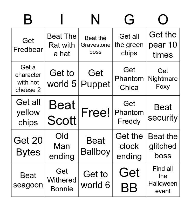 This bingo card has a free space and 24 words: Old Man ending, Get Withered Bonnie, Get Puppet, Beat seagoon, Get the pear 10 times, Get Fredbear, Get a character with hot cheese 2, Beat The Rat with a hat, Get Phantom Freddy, Beat Ballboy, Get Phantom Chica, Get all yellow chips, Get the clock ending, Beat the glitched boss, Get to world 5, Get BB, Beat security, Beat the Gravestone boss, Get Nightmare Foxy, Beat Scott, Find all the Halloween event, Get 20 Bytes, Get all the green chips and Get to world 6.