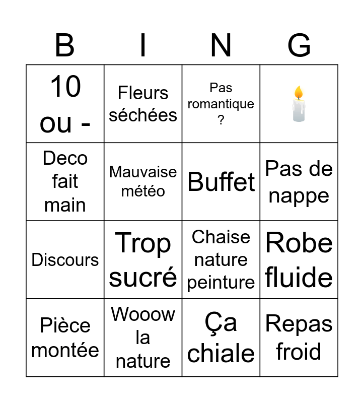 This bingo card has 16 words: Wooow la nature, Robe fluide, Pas romantique ?, 10 ou -, Discours, Fleurs séchées, Chaise nature peinture, Ça chiale, Deco fait main, Mauvaise météo, Pièce montée, 🕯️, Trop sucré, Pas de nappe, Buffet and Repas froid.