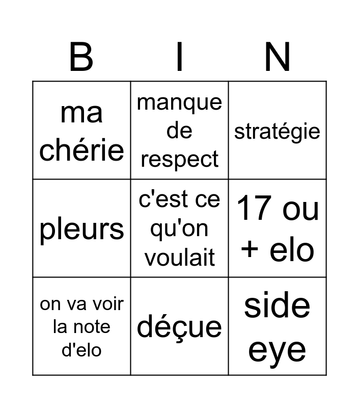 This bingo card has a free space and 8 words: 17 ou + elo, stratégie, manque de respect, on va voir la note d'elo, ma chérie, side eye, pleurs and déçue.